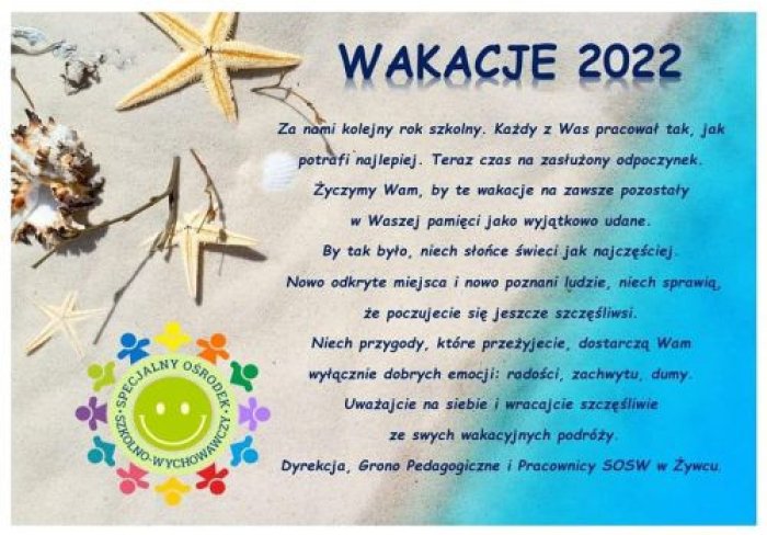 Życzymy Wam, by te wakacje na zawsze pozostały w Waszej pamięci jako wyjątkowo udane. By tak było, niech słońce świeci jak najczęściej. Nowo odkryte miejsca i nowo poznani ludzie, niech sprawią, że poczujecie się jeszcze szczęśliwsi. Niech przygody, które przeżyjecie, dostarczą Wam wyłącznie dobrych emocji: radości, zachwytu, dumy. Uważajcie na siebie i wracajcie szczęśliwie ze swych wakacyjnych podróży. Dyrekcja, Grono Pedagogiczne i Pracownicy SOSW w Żywcu.